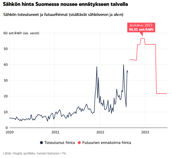 Sähkön toteutunut hinta ja futuurien ennakoima hinta Suomessa. Kuvan lähde: Yle